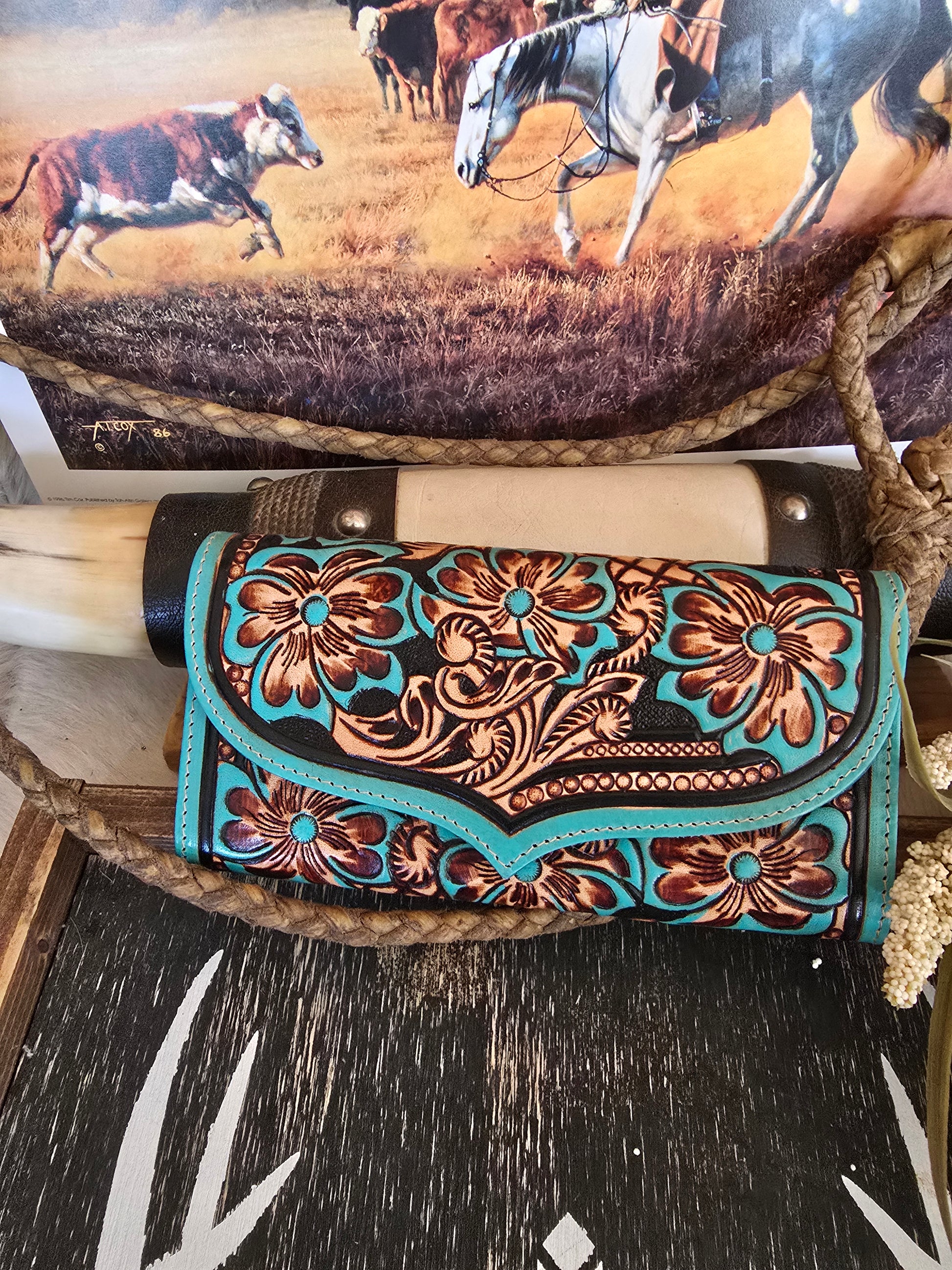 Wonderful tones of turquoise highlight this delightful hand-tooled leather wallet. Classic hand-tooling features picturesque desert blooms. Also features bright turquoise leather trim. Interior has spacious sections, including a zippered pocket. An alluring wallet for any collection!