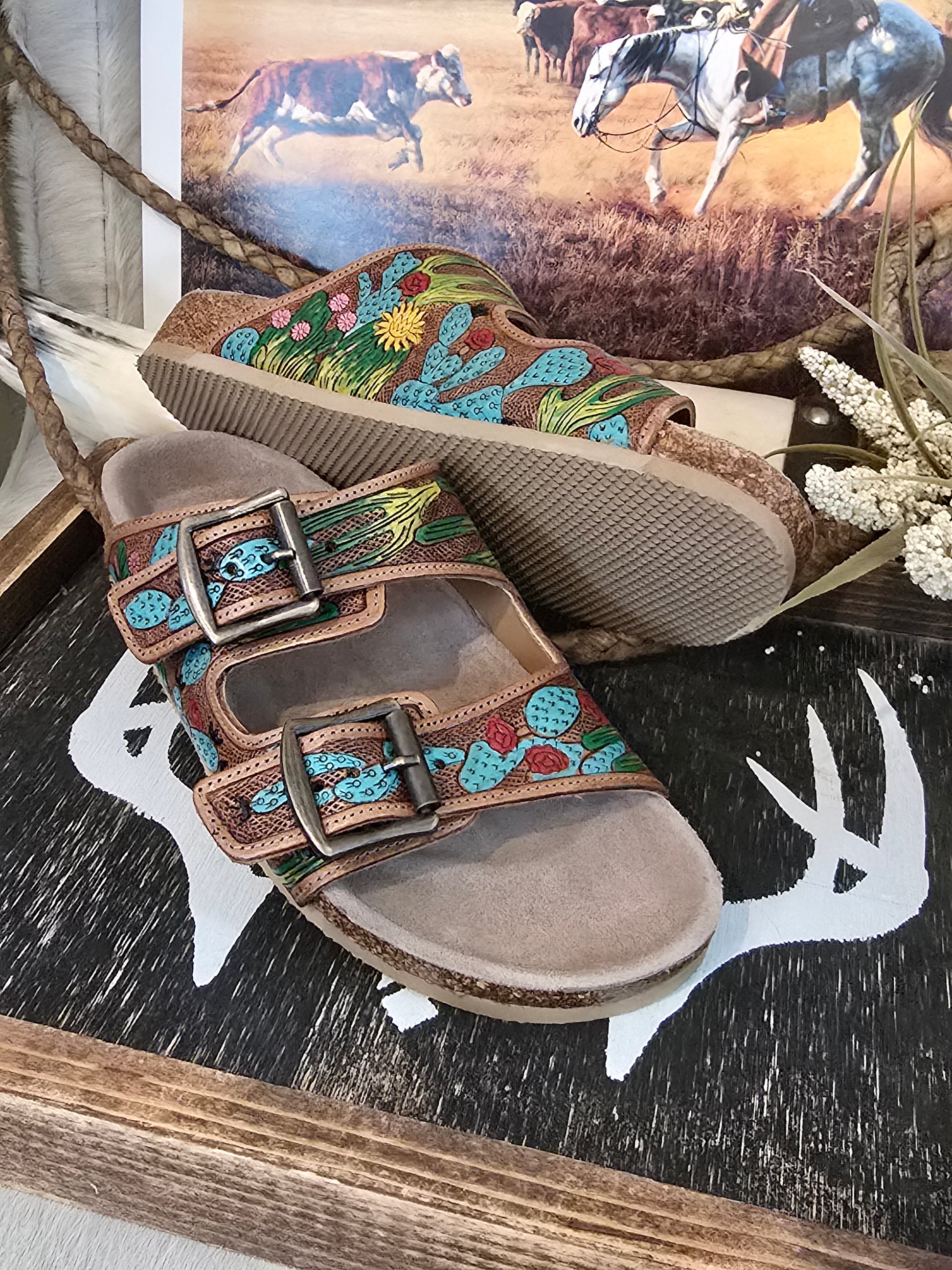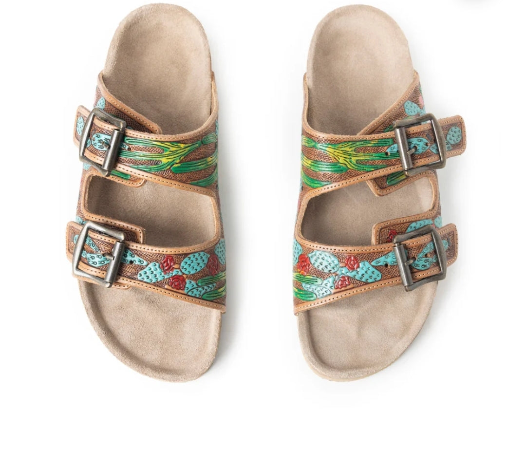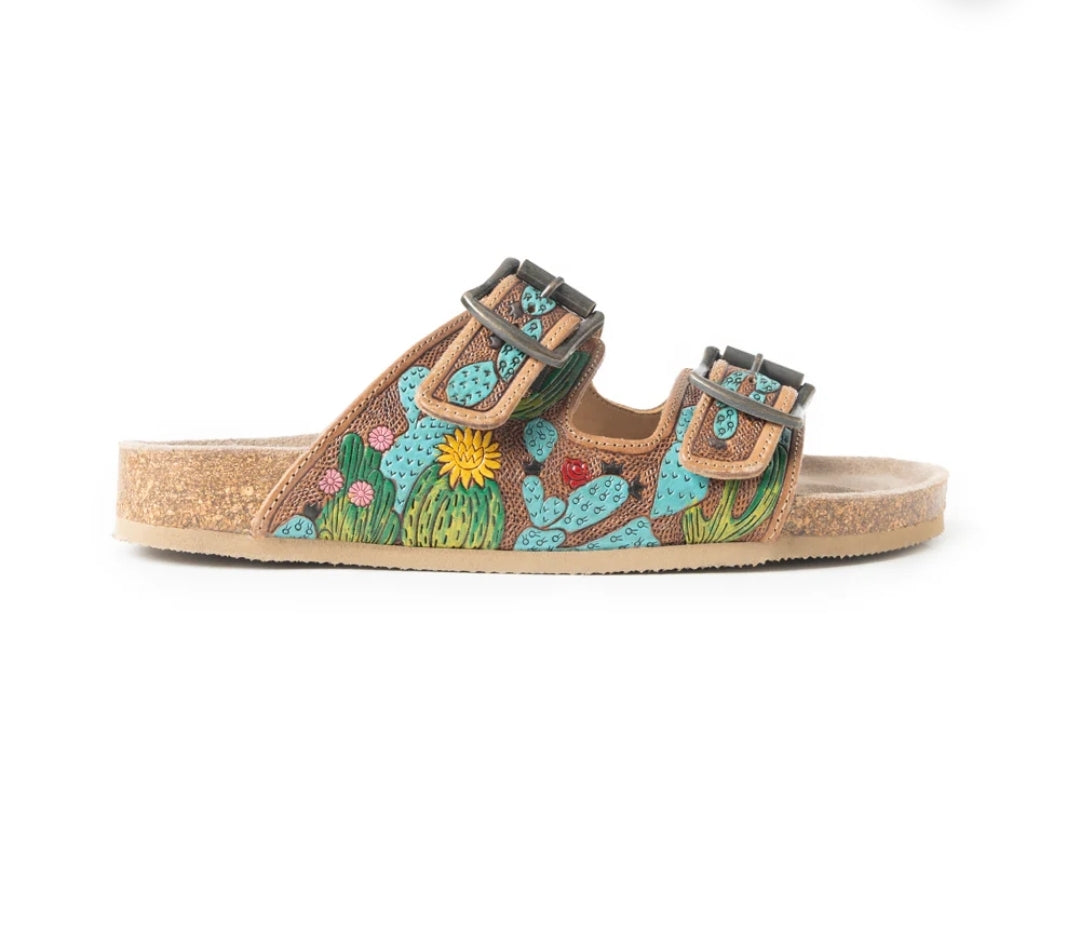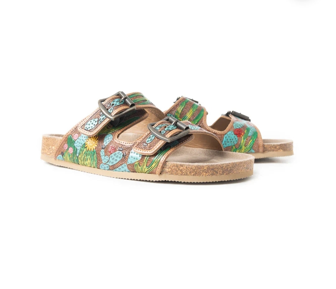 Step into boho-Western elegance with these hand-tooled leather sandals. Featuring delicate silver feather accents and antique buckle details on a cork footbed, these adjustable slides merge free-spirited style with everyday comfort. Perfect for the modern wanderer.